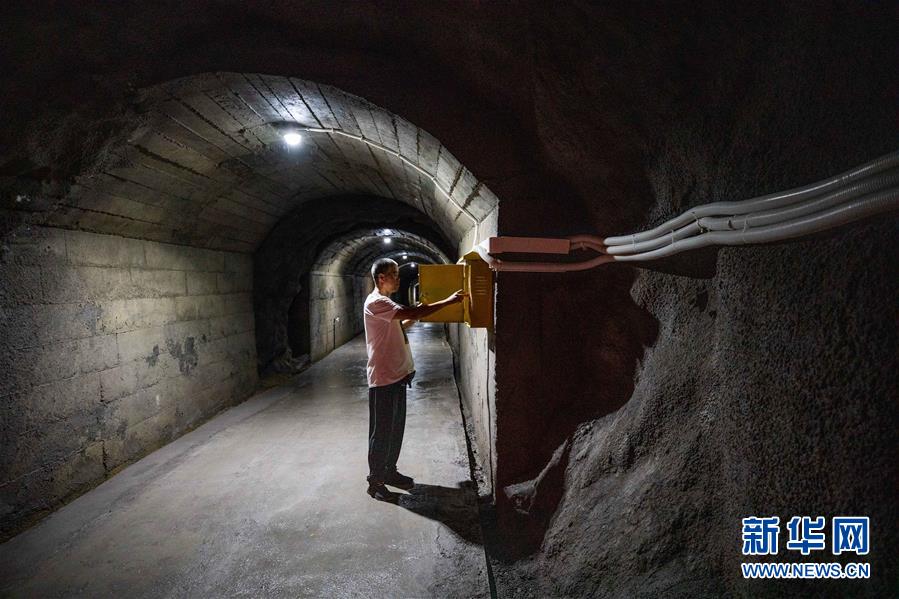 8月14日,在贵州省毕节市倒天河水库,王家勋在灌浆平洞隧道里检查电箱。新华社发(罗大富 摄)