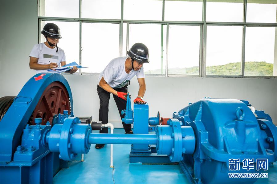 8月14日,在贵州省毕节市倒天河水库,王家勋(右)和同事一起检查闸门启闭设备。新华社发(罗大富 摄)
