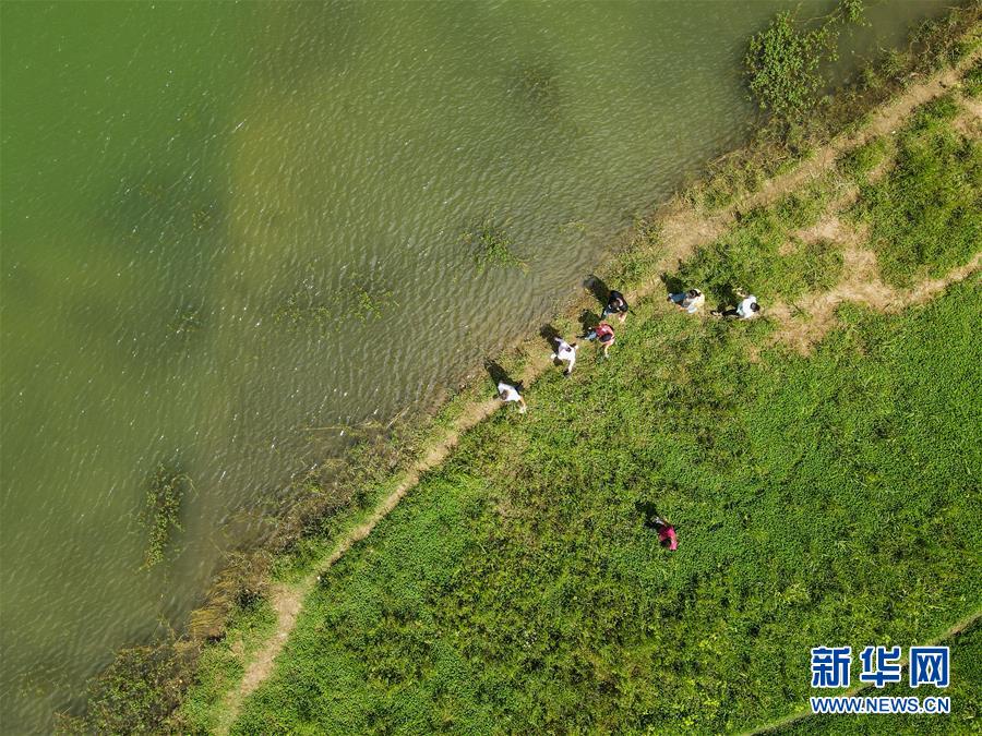 8月14日,在贵州省毕节市倒天河水库,王家勋在收集库区垃圾。新华社发(罗大富 摄)