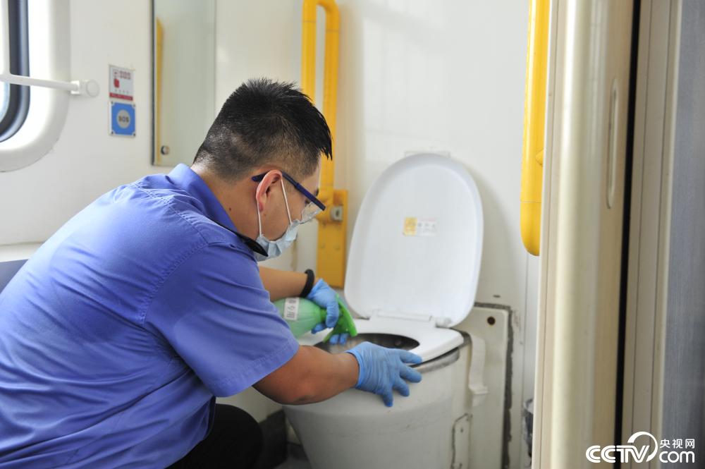 疫情期间,列车乘务员随时要对列车的扶手、水龙头、冲水按钮、垃圾箱盖进行逐一擦拭,每间隔两个小时,还要对列车进行一次消毒,以保障旅客和工作人员的安全。甄鹏说:“春节期间的疫情,大家都觉得距离自己非常遥远,现在疫情就在身边,大家的重视程度也都提高了。守护着乘客的安全,是我们的责任和义务。”(刘泽 摄影报道)