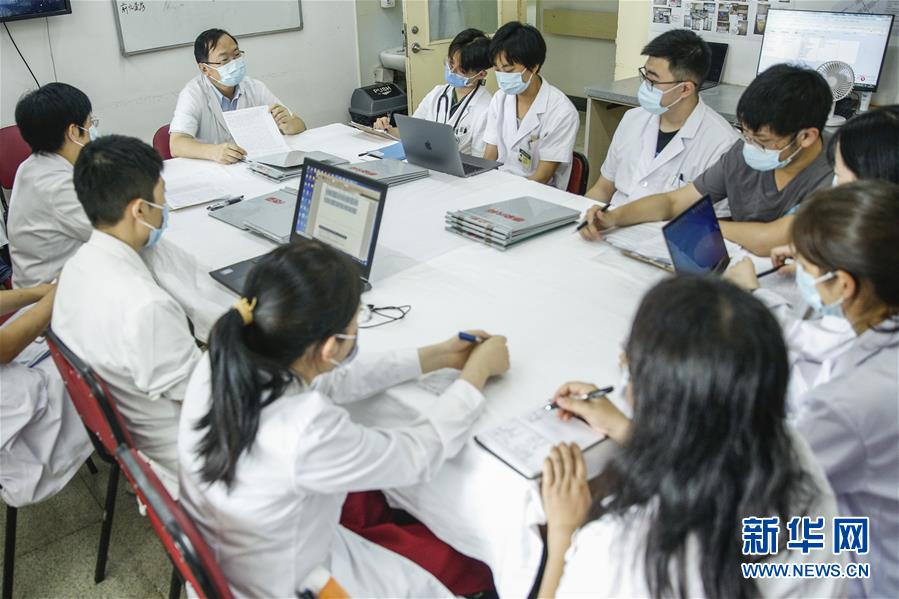 8月14日,刘正印(左二)在北京协和医院感染内科病房内讨论病历。新华社记者 张玉薇 摄