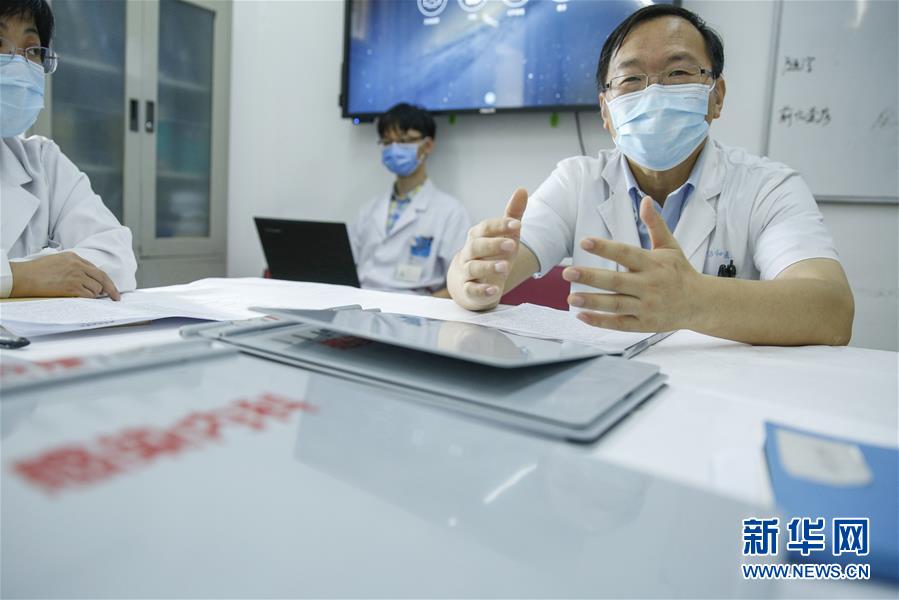 刘正印(右二)在湖北武汉同济医院中法新城院区与同事讨论(2月14日摄)。新华社发(崔萌 摄)