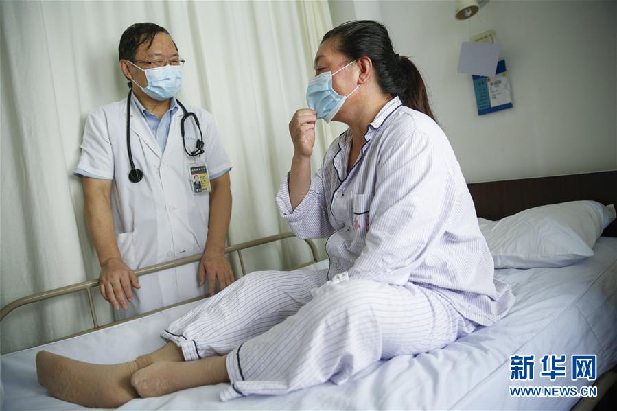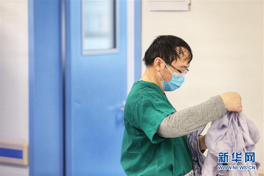 刘正印在湖北武汉同济医院中法新城院区离开病房浑身湿透(2月14日摄)。新华社发(崔萌 摄)