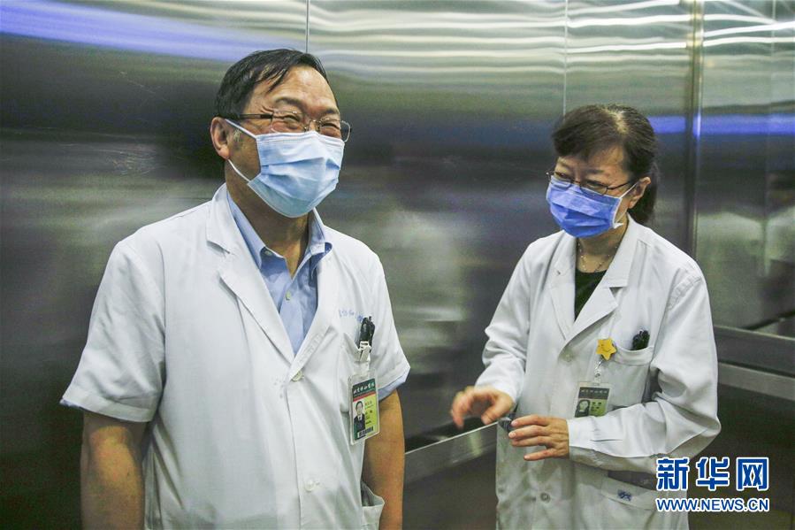8月14日,刘正印(左)在北京协和医院电梯里和同事交流。新华社记者 张玉薇 摄