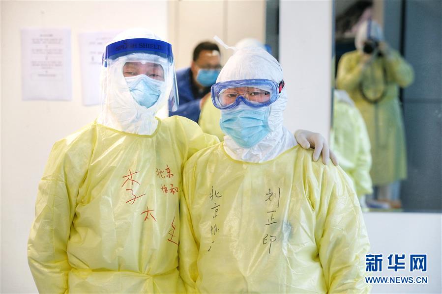 刘正印(右)在湖北武汉同济医院中法新城院区与感染内科主任李太生在一起(2月14日摄)。新华社发(崔萌 摄)