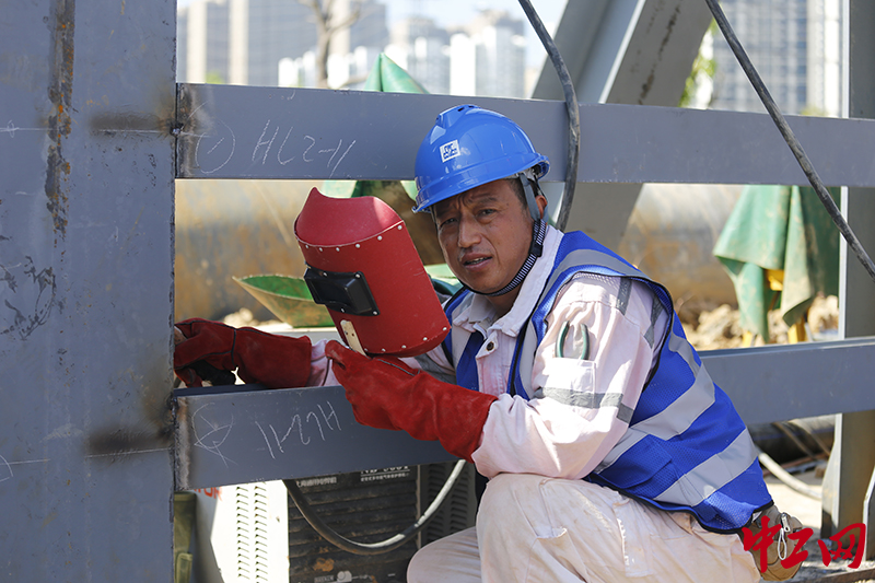 当天的地表温度近40度,焊枪和钢架轻轻接触,擦出点点焊花,四处飞溅,给周围的空气不断“加热”,使得焊接作业面温度接近50度,整个项目像极了一个巨大的“蒸笼”。手臂倚靠着炙热的钢梁,48岁的焊工吴国洲正拿着焊枪焊接生化池结构墙的钢板。“这个生化池的墙面的密封性要求很高,后面需要用来处理东西湖区的污水,关系重大,必须要保持全神贯注,确保施工质量。”吴国洲说,从早上6点上班拿起焊枪,除了中间喝水和上厕所,基本上不能放下,因为稍不留神就可能出现问题。