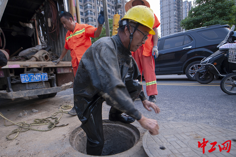 污水管道养护工完成了井下工作,正从井底上来。(宋伟/视觉中国)