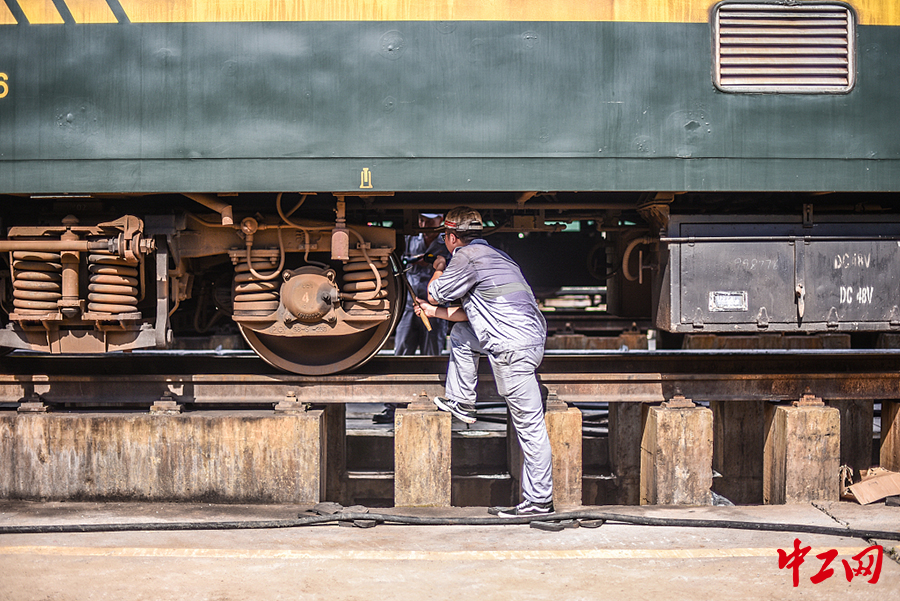 8月16日,安徽阜阳,高温持续,列检员们依旧坚守在岗位,保证每一列出行列车的安全。(余亮/视觉中国)
