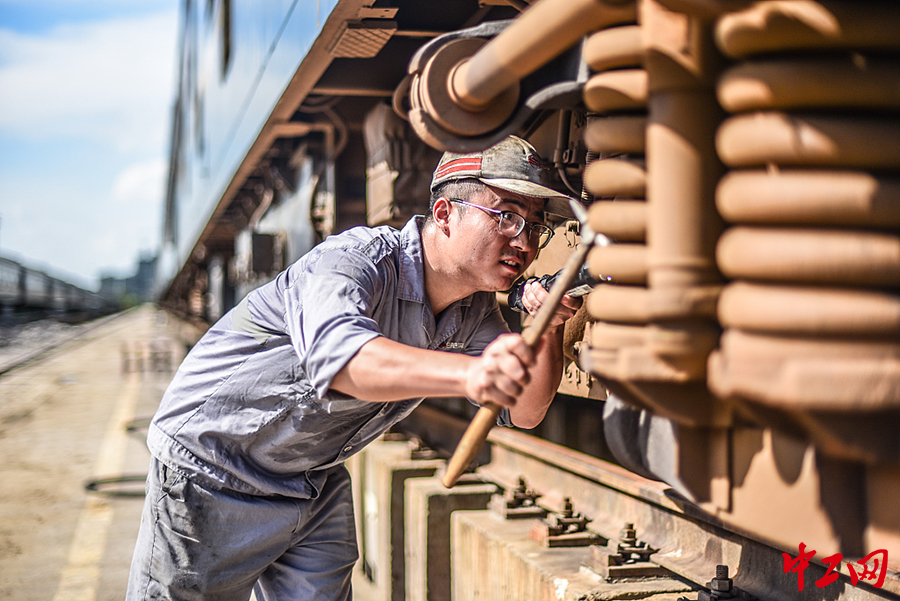 8月16日,安徽阜阳,高温持续,列检员们依旧坚守在岗位,保证每一列出行列车的安全。(余亮/视觉中国)