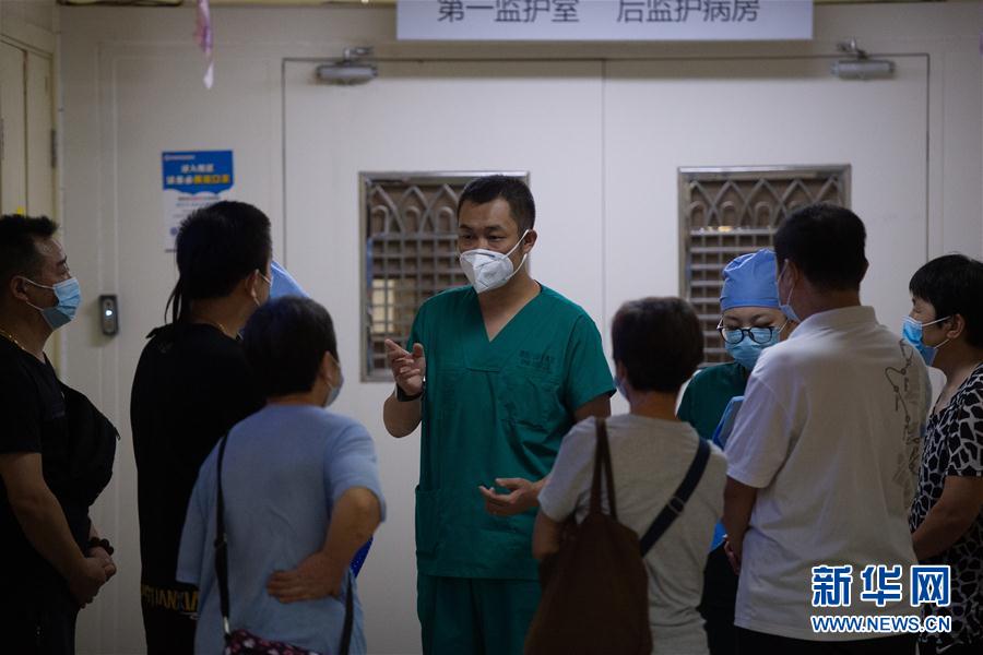 8月17日晚,北京朝阳医院急诊医生杨军(中)在病房外和患者家属交谈。 新华社记者 陈钟昊 摄