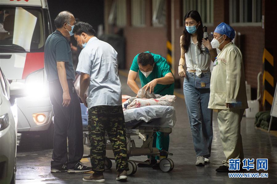 8月17日晚,北京朝阳医院急诊医生杨军(中)对刚刚送来的患者进行初步检查。 新华社记者 陈钟昊 摄