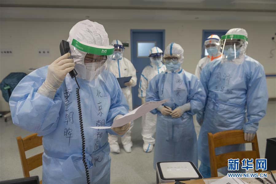 童朝晖(左一)在湖北武汉同济医院中法新城院区与医疗队医生沟通(3月23日摄)。 新华社发(潘松刚 摄)