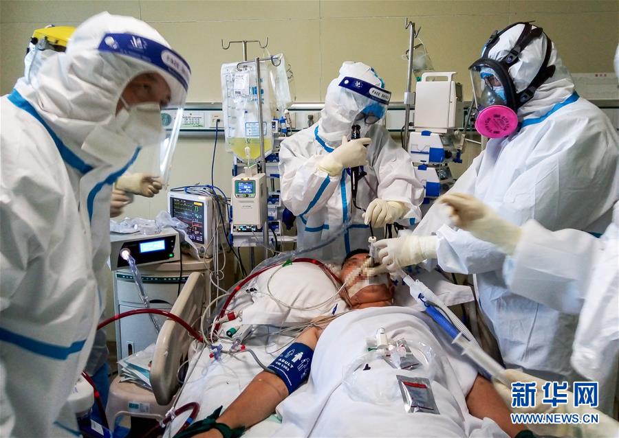 童朝晖(中)在北京地坛医院为危重症患者做气管镜(7月25日手机拍摄)。 新华社发