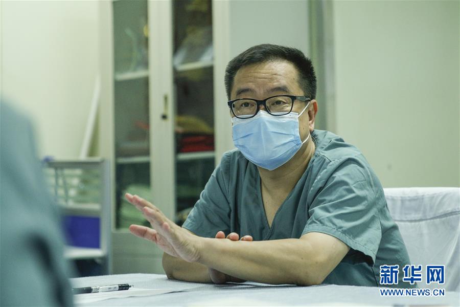 8月13日,来北京地坛医院增援的童朝晖在重症医学科办公室内讨论病历。 新华社记者 张玉薇 摄