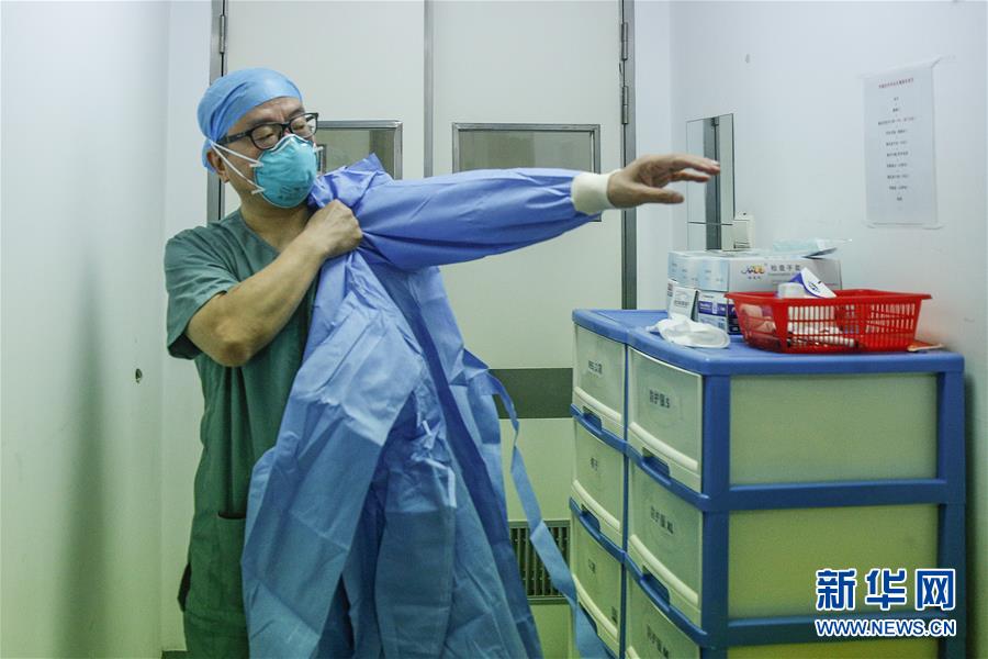 8月13日,来北京地坛医院增援的童朝晖在重症医学科穿上防护服。 新华社记者 张玉薇 摄