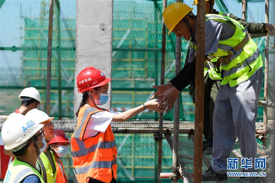 8月19日,“小候鸟”在浙江义乌世茂项目建设工地为工人送上清凉食品。 当日,在中建三局三公司华东分公司浙江义乌世茂项目建设工地,来自安徽、江西、湖北等地的26位外来务工人员子女参加了为他们组织的夏令营公益活动。即将陆续返乡的“小候鸟”们上了一堂安全课程,还参观了父母工作的建设工地。 新华社记者 黄宗治 摄