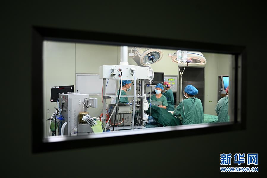8月19日,在广西柳州市人民医院,陈煜岊(左二)与丈夫吴惊雷(左一)在手术室里为手术做准备。 新华社发(黎寒池 摄)
