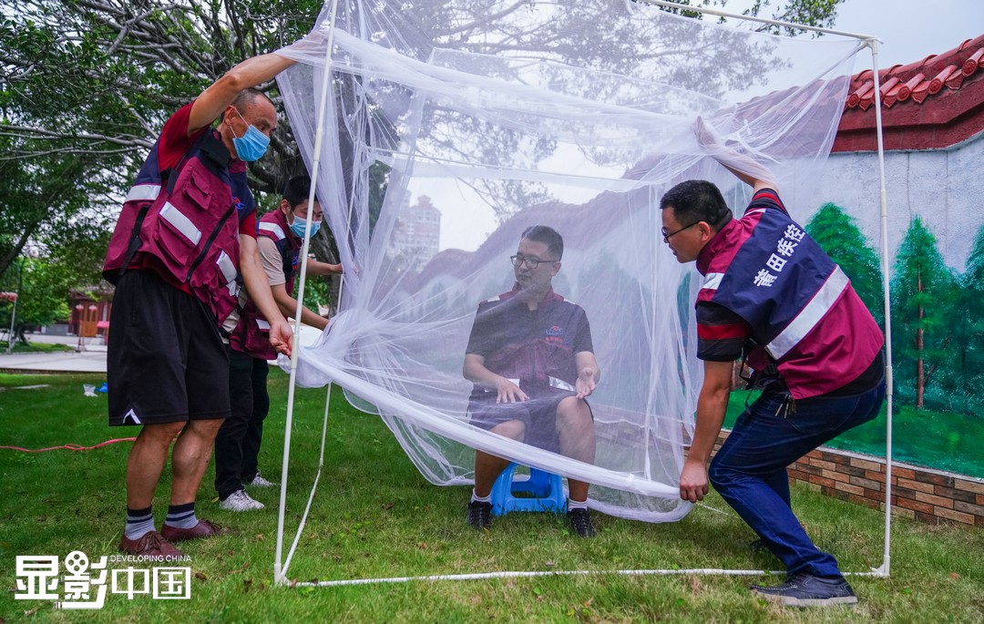 傍晚时分,莆田市疾控人员在当地一处公园搭设双层蚊帐,吴泽铸(右二)进入蚊帐内层,准备诱捕蚊子。
