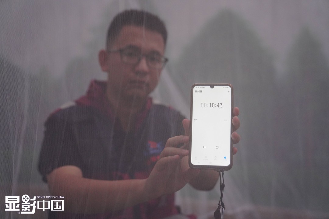 这是透过双层蚊帐拍摄到的场景,疾控人员吴泽铸用手机展示倒计时。夏日高温,蚊帐中很闷热,这项检测要持续30分钟。