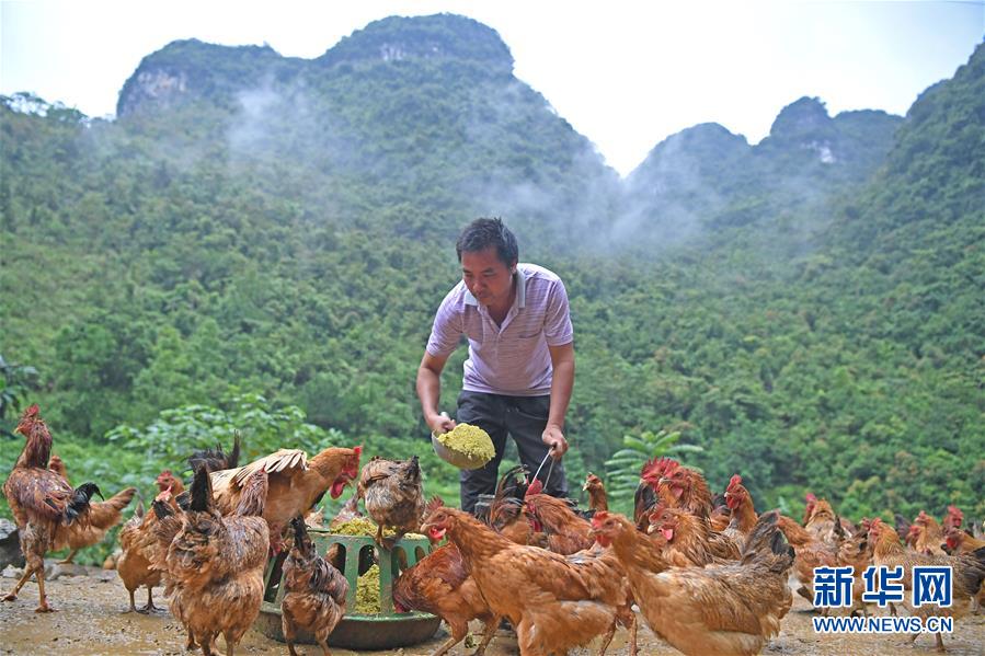 8月20日,在广西都安瑶族自治县龙湾乡琴棋村,蓝国前在喂鸡。 蓝国前家住广西都安瑶族自治县龙湾乡琴棋村,他和爱人蓝月艳曾常年在外地建筑工地上务工,维持一家人生计。今年受疫情影响,他们不便外出务工,决定在家养鸡创业。目前,他们在村养殖基地养有活鸡3000只,还带动琴棋村近20户村民发展养鸡,蓝国前也被村民亲切地称为大山里的“鸡司令”。 新华社记者 周华 摄