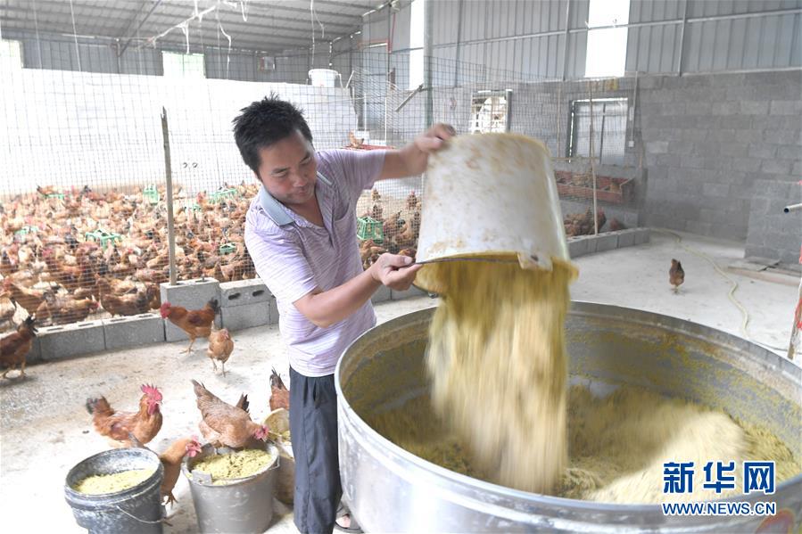 8月20日,在广西都安瑶族自治县龙湾乡琴棋村,蓝国前在配制鸡饲料。 蓝国前家住广西都安瑶族自治县龙湾乡琴棋村,他和爱人蓝月艳曾常年在外地建筑工地上务工,维持一家人生计。今年受疫情影响,他们不便外出务工,决定在家养鸡创业。目前,他们在村养殖基地养有活鸡3000只,还带动琴棋村近20户村民发展养鸡,蓝国前也被村民亲切地称为大山里的“鸡司令”。 新华社记者 周华 摄