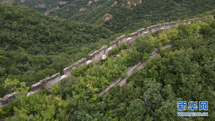 8月20日,张鹤珊在长城上巡视(无人机照片)。 新华社记者 牟宇 摄
