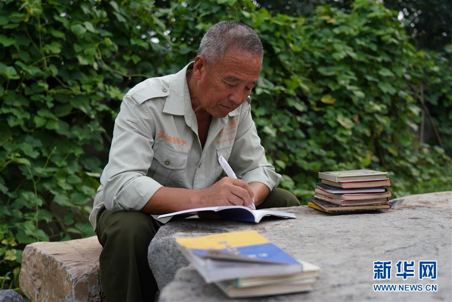 8月20日,张鹤珊在家中的院子里记录长城巡查内容。新华社记者 牟宇 摄