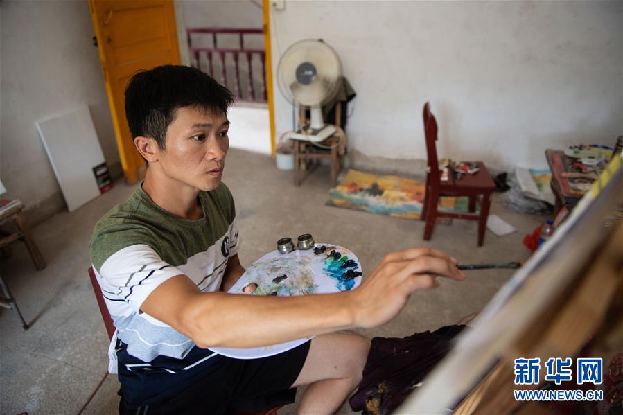 在横市镇云山村,肖明在家中作画(8月19日摄)。新华社记者 陈思汗 摄