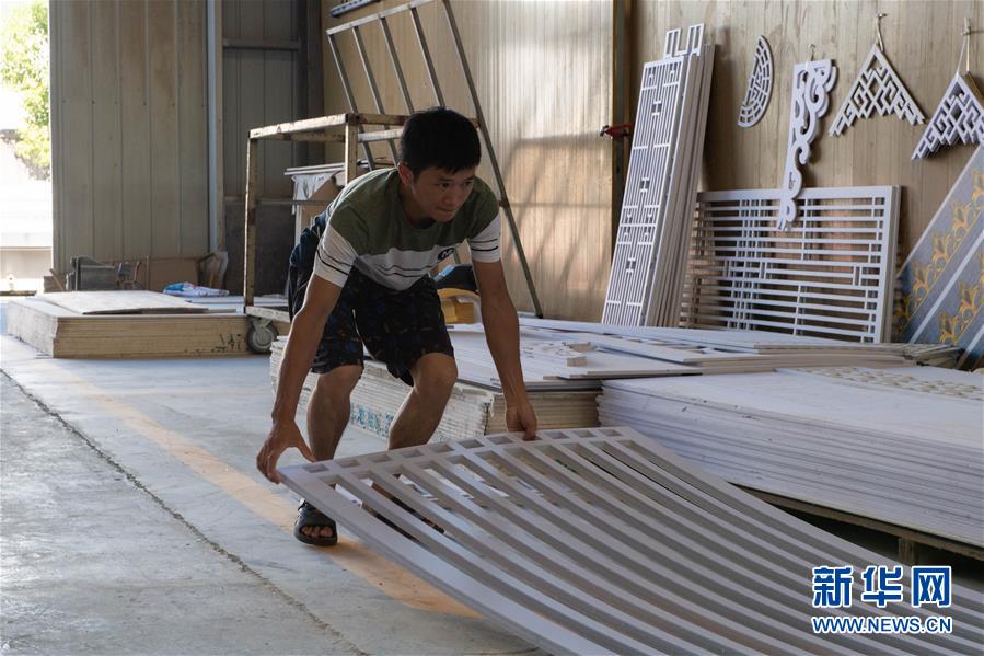 在宁乡市区的某装修材料加工车间,肖明在摆放雕刻好的装饰材料(8月20日摄)。新华社记者 陈思汗 摄