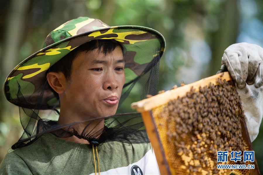 在横市镇云山村,肖明仔细观察蜜蜂状态(8月19日摄)。新华社记者 陈思汗 摄
