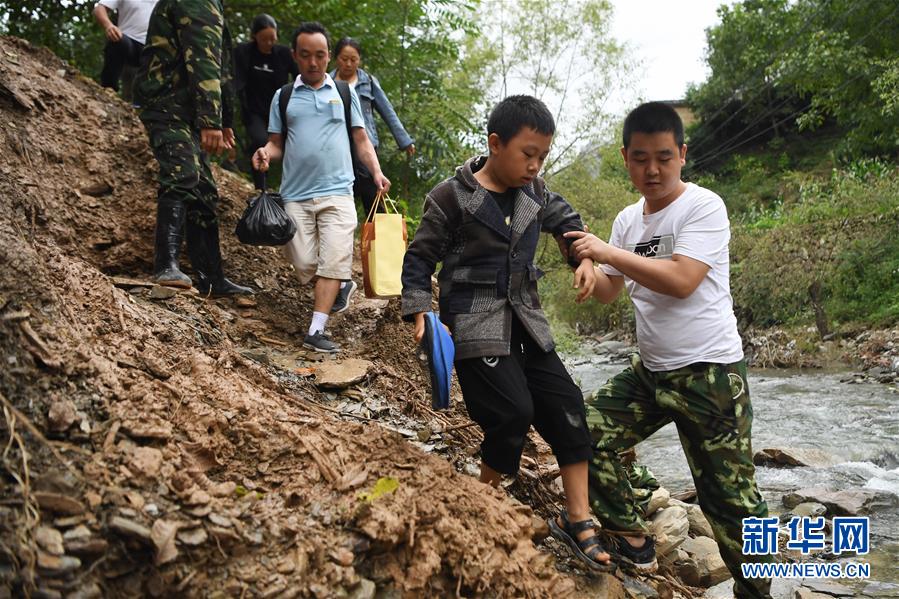 8月22日,在陇南市武都区洛塘镇和平村,乡镇干部王辉(右一)帮助孩子绕行通过受阻路段。临近开学,甘肃省陇南市各县区部分村庄通往外界的道路因暴洪、滑坡、泥石流等自然灾害中断。为确保孩子们顺利返校,当地组织多支道路抢险小分队,抢修中断的通村道路,一线干部群众和家长自发组织起志愿服务队,守护孩子们的平安上学路。新华社记者 陈斌 摄