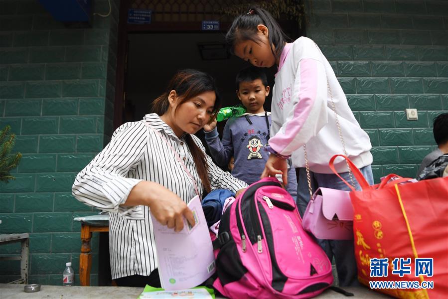 8月22日,在陇南市武都区洛塘镇和平村,一名家长帮孩子整理书包准备出发前往学校。临近开学,甘肃省陇南市各县区部分村庄通往外界的道路因暴洪、滑坡、泥石流等自然灾害中断。为确保孩子们顺利返校,当地组织多支道路抢险小分队,抢修中断的通村道路,一线干部群众和家长自发组织起志愿服务队,守护孩子们的平安上学路。新华社记者 陈斌 摄