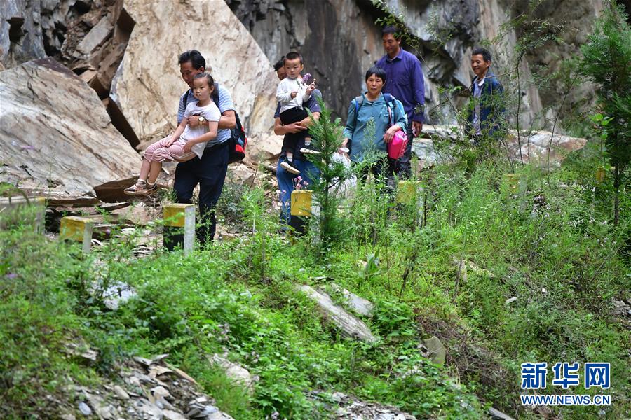 8月22日,在陇南市武都区洛塘镇和平村,乡镇干部和家长带着孩子前往学校所在地。 临近开学,甘肃省陇南市各县区部分村庄通往外界的道路因暴洪、滑坡、泥石流等自然灾害中断。为确保孩子们顺利返校,当地组织多支道路抢险小分队,抢修中断的通村道路,一线干部群众和家长自发组织起志愿服务队,守护孩子们的平安上学路。 新华社记者 陈斌 摄