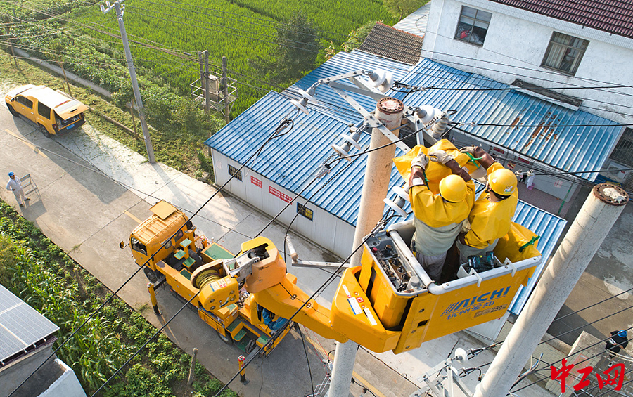 8月23日,江苏省海安市供电公司电力工人在烈日下加紧带电作业以提升供电能力。连日来,面对来势汹汹的"秋老虎",江苏省海安市供电公司积极落实高温保电各项措施,确保广大居民高温天气下安全用电。(姜明/视觉中国)
