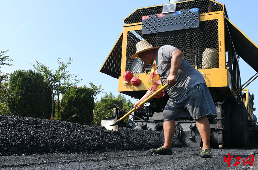8月24日,在浙江S322省道台州市仙居县田市镇的公路修复施工现场,机械轰鸣,公路养护人员冒高温酷暑施工作业。(王华斌/视觉中国)