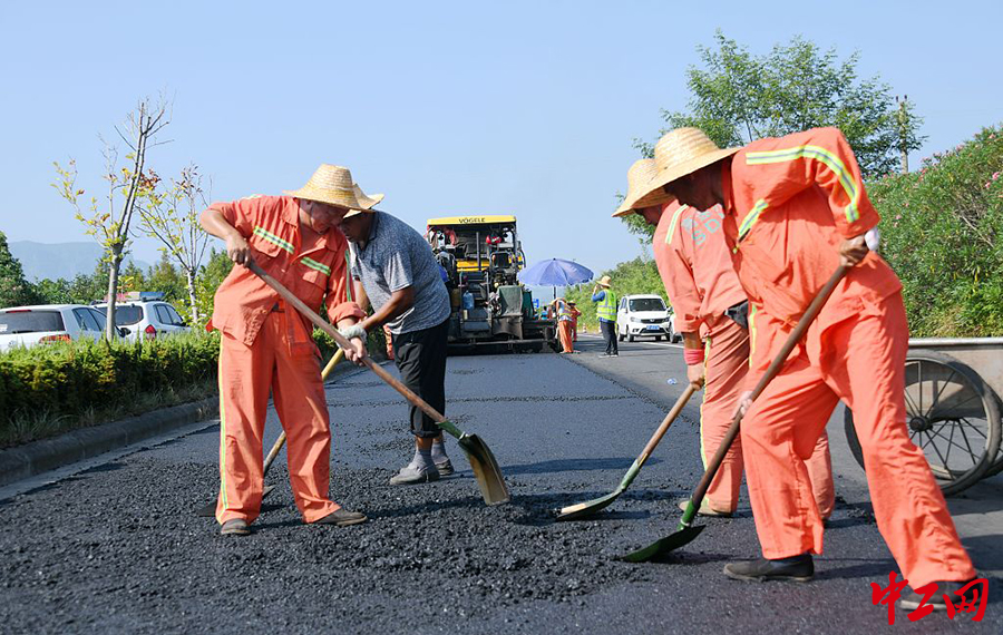 8月24日,在浙江S322省道台州市仙居县田市镇的公路修复施工现场,机械轰鸣,公路养护人员冒高温酷暑施工作业。(王华斌/视觉中国)