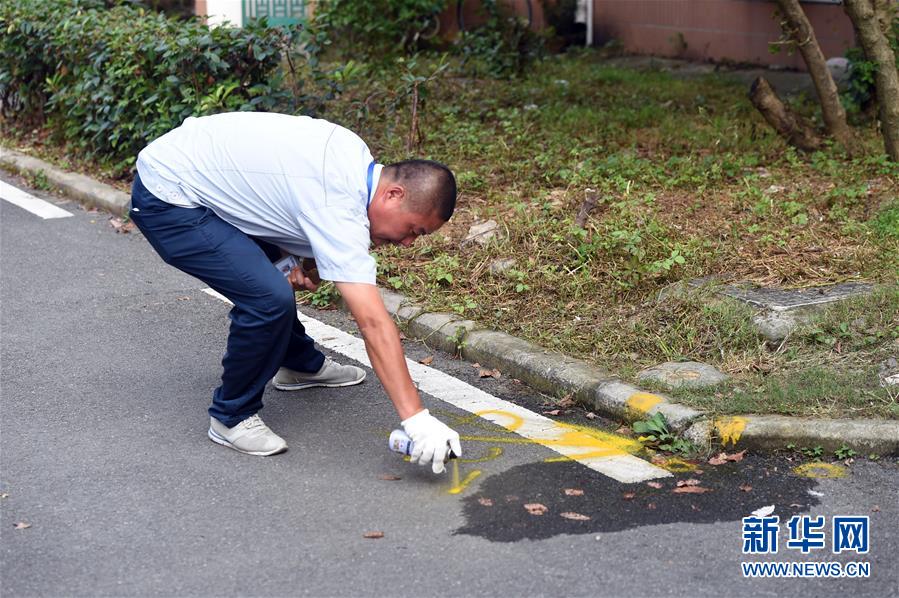 8月25日,在合肥市蜀山区邮电新村小区,听漏队队员吕军在查明管道漏水位置后,在地上喷涂做标记。 新华社记者 周牧 摄