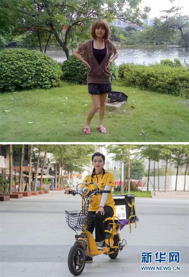 这是一张拼版照片。上图为2012年在深圳一家电子厂打工的蔡丽欣(新华社发);下图为2020年8月21日,身着工作服的蔡丽欣在深圳街头(新华社记者毛思倩摄)。