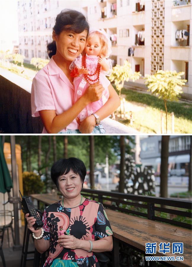 这是一张拼版照片。上图为1982年,翁纯贤在深圳蛇口的凯达玩具厂拿着玩偶留影(新华社发);下图为2020年8月21日,翁纯贤在深圳蛇口一个创意园内拿着90年代购买的大哥大和凯达玩具厂的玩具留影(新华社记者毛思倩摄)。
