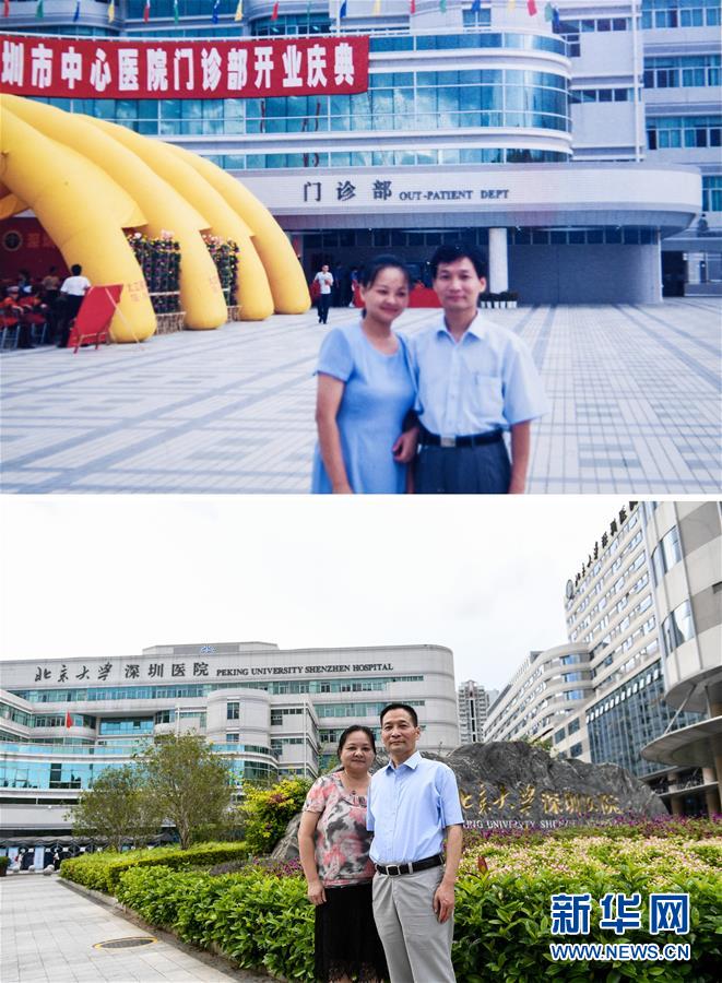 这是一张拼版照片。上图为1999年韦伟和夫人陈榕在深圳市中心医院开业庆典时留影(新华社发);下图为2020年8月15日,夫妻二人在北京大学深圳医院留影(新华社记者毛思倩摄)。