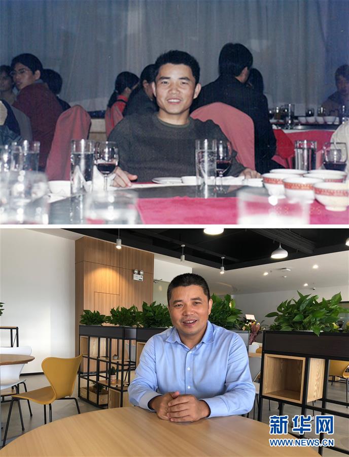 这是一张拼版照片。上图为2003年翟留伟在其工作的公司年度总结会上留影(新华社发);下图为2020年8月15日,翟留伟在自己创办的公司里留影(新华社记者赵瑞希摄)。