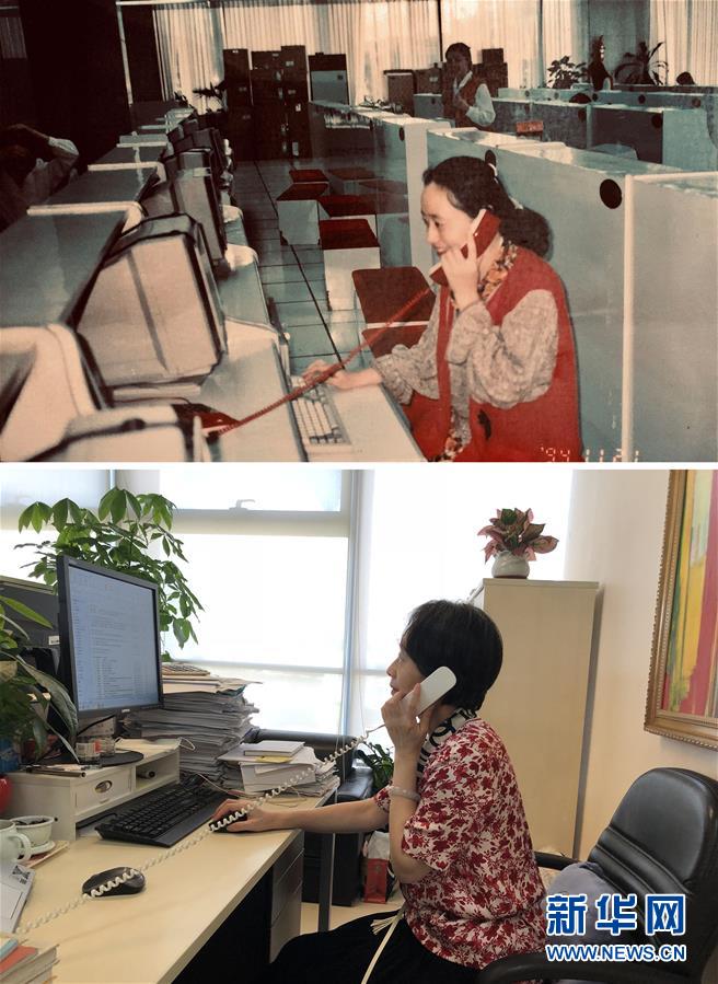 这是一张拼版照片。上图为1994年林萍在深交所担任出市代表(“红马甲”)时留影(新华社发);下图为2020年8月14日,林萍在证券公司里工作(新华社记者赵瑞希摄)。