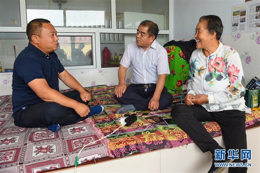 王华(左)在白音特拉村村民张丽端(右)家中向夫妻二人询问生活近况(8月18日摄)。