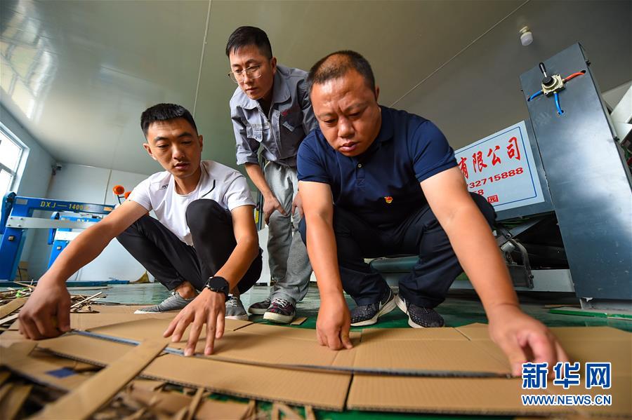 在白音特拉村脱贫产业园的包装箱加工生产线旁,王华(右)和工作人员测量包装箱样品的尺寸(8月18日摄)。新华社记者 彭源 摄