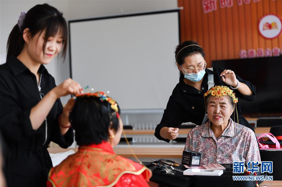 在白音特拉村的村民活动室内,化妆师义务为村民化妆,为拍摄照片进行准备(8月20日摄)。新华社记者 刘磊 摄