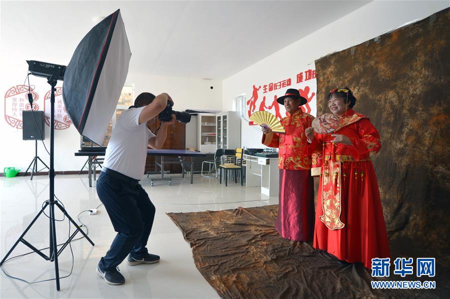 在白音特拉村的村民活动室内,王华(左)为村民徐进莲(右)、王佃明拍摄合影(8月20日摄)。新华社记者 徐钦 摄