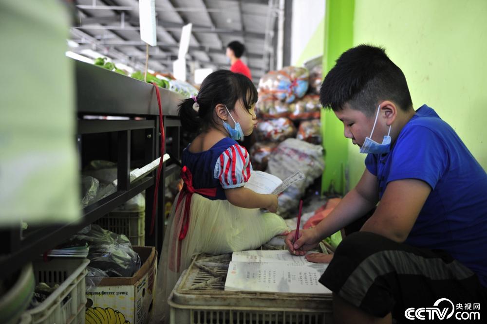 菜市场人来人往,有些嘈杂。为了方便照看两个孩子,刘家豪的妈妈从摆满各种蔬菜的摊位下挪出一小块地方,放上一块木板,还从市场上买回一台二手的平板电脑。每天,妈妈做生意的时候,11岁的刘家豪就带着3岁妹妹在木板上写作业、练习简笔画。
