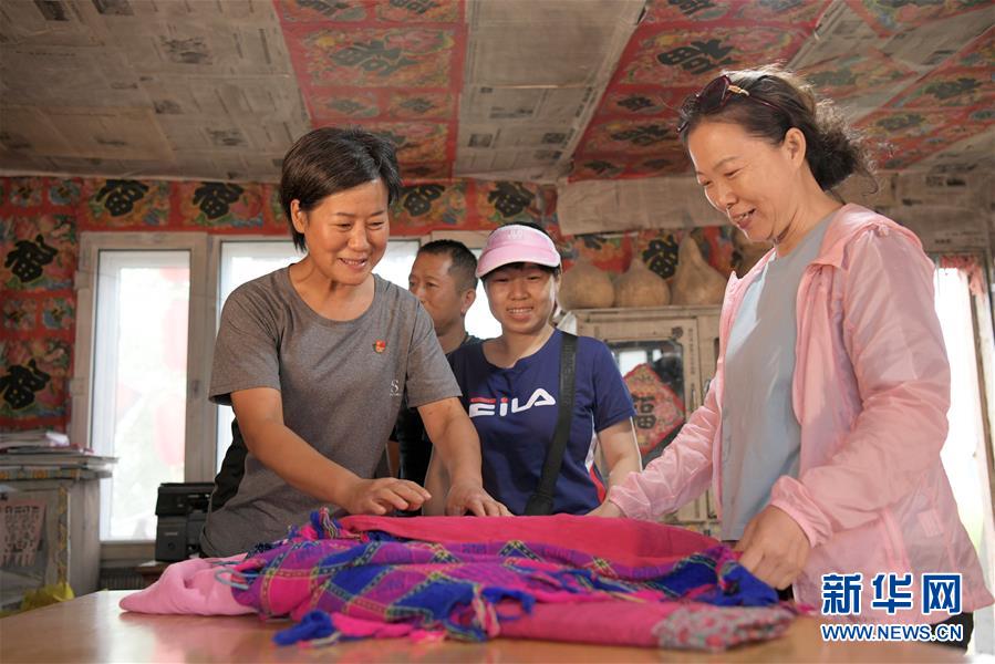 在小南河村网红景点“福屋”内,冷菊贞(前左)给游客展示特色服装(8月19日摄)。新华社记者 王建威 摄