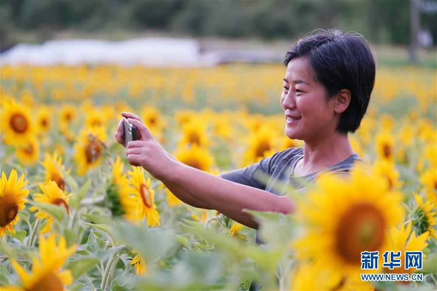 冷菊贞在村里的景点记录向阳葵生长情况(8月17日摄)。新华社记者 王建威 摄