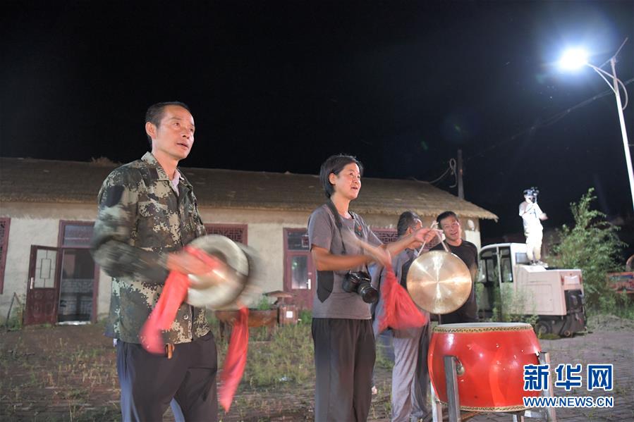 冷菊贞(左二)在小南河村旅游项目中敲锣(8月18日摄)。 新华社记者 王建威 摄